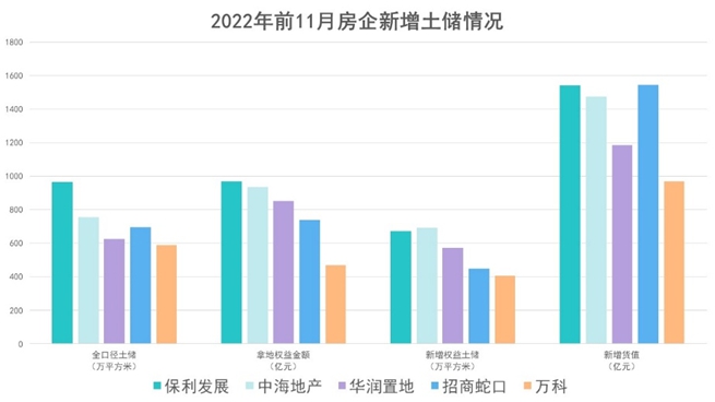 另外,根據(jù)觀點(diǎn)指數(shù)發(fā)布的2022年房地產(chǎn)企業(yè)新增土地儲(chǔ)備報(bào)告,在權(quán)益拿地金額中,2022年前11月土地投資力度最大的房企為保利發(fā)展,對(duì)應(yīng)拿地支出為967.6億元,新增權(quán)益土儲(chǔ)671.3萬(wàn)平方米,新增可售貨值1545.6億元。