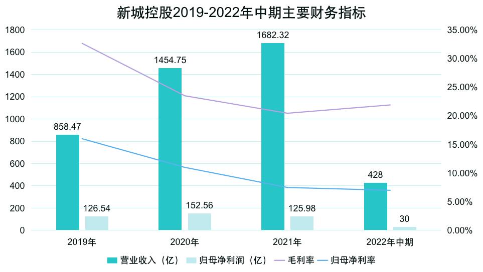 2022上半年,新城實(shí)現(xiàn)營業(yè)收入428.03億元,較上年同期下降45.89%,當(dāng)中商業(yè)運(yùn)營總收入47.18億,同比增長19.8%;實(shí)現(xiàn)歸屬于上市公司股東的凈利潤30.10億元,較上年同期下降30.11%。