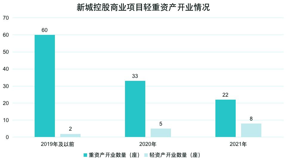 能夠發(fā)現(xiàn)的是,在新城控股開業(yè)商業(yè)項(xiàng)目中,輕資產(chǎn)項(xiàng)目比重也在不斷提升。