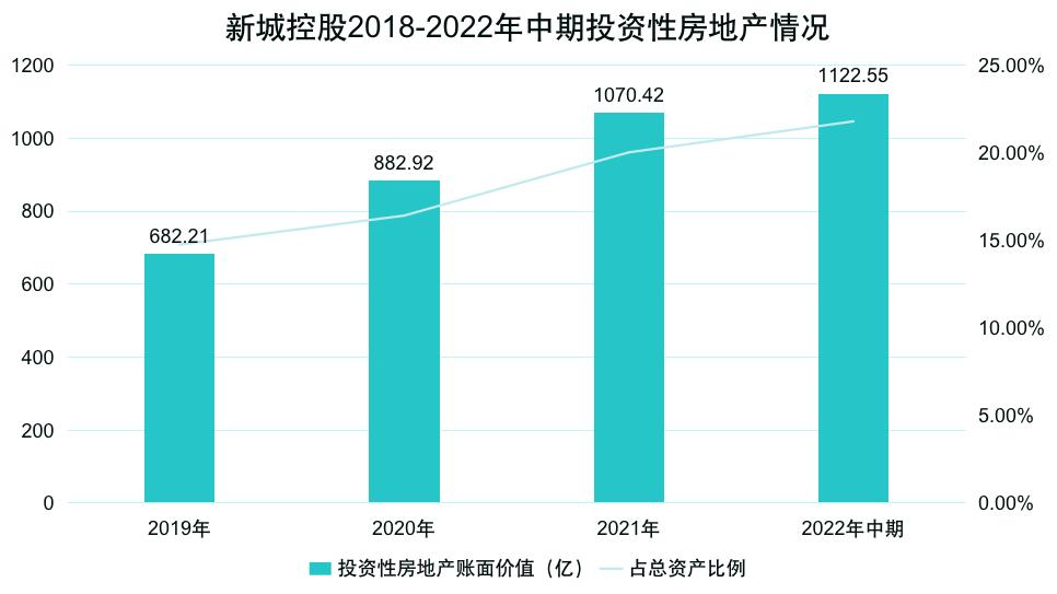若將時(shí)間線拉長,近三年及2022年中期,新城控股投資性房地產(chǎn)增長較快,占總資產(chǎn)比例逐步提升。用公允價(jià)值計(jì)量的賬面價(jià)值分別為682.21億元、882.92億元、1070.42億元和1122.55億元,占總資產(chǎn)的比例分別為14.76%、16.42%、20.03%和21.8%。
