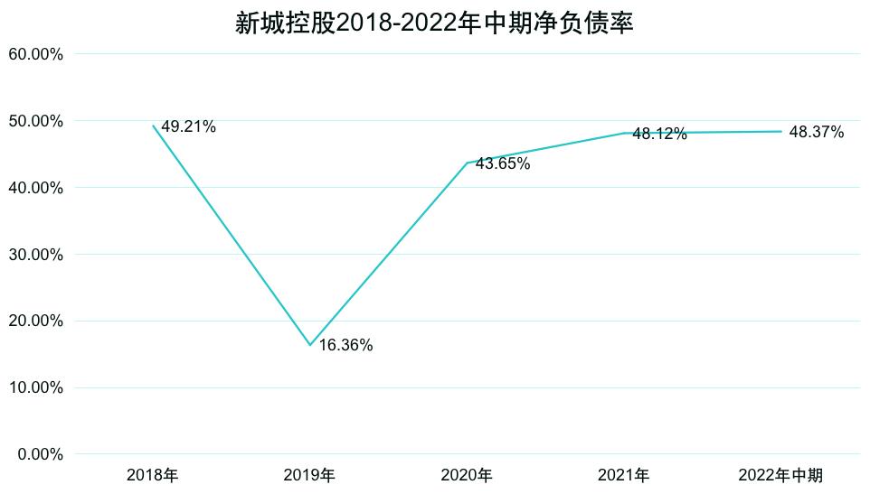 2018年以來,一直保持不超過50%的凈負(fù)債率(2018年49.21%、2019年16.36%、2020年43.65%、2021年48.12%);2019年,新城的凈負(fù)債率低至16.36%。