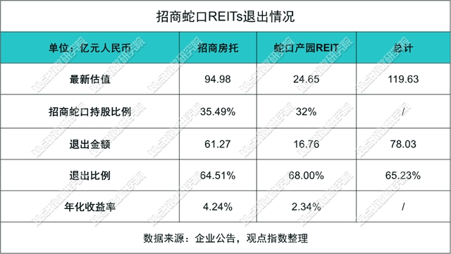 據(jù)觀點(diǎn)指數(shù)測算,招商蛇口通過REITs平臺(tái)退出的總金額約78.03億元,退出比例約65.23%,平均年化收益率約3.29%。
