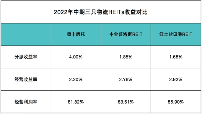 但從分派率角度觀察,順豐房托2022年中期收益分派率(年化)達到8.00%,其它兩只REITs在股價走高后,收益率則降至4%,已深刻反映出不同市場間的巨大差距。