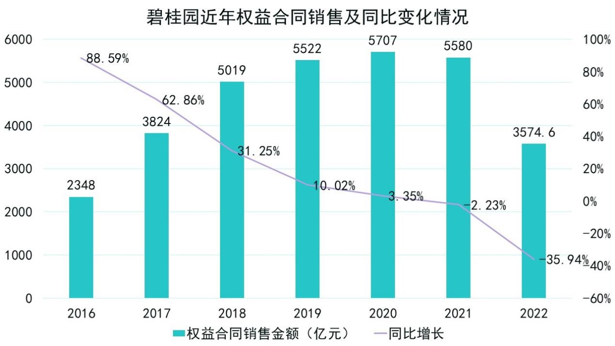 可以窺見,2018年后,碧桂園銷售增幅相較此前巔峰時期已經有了明顯減速,2022全年,錄得權益銷售額3574.6億元,同比減少35.94%。