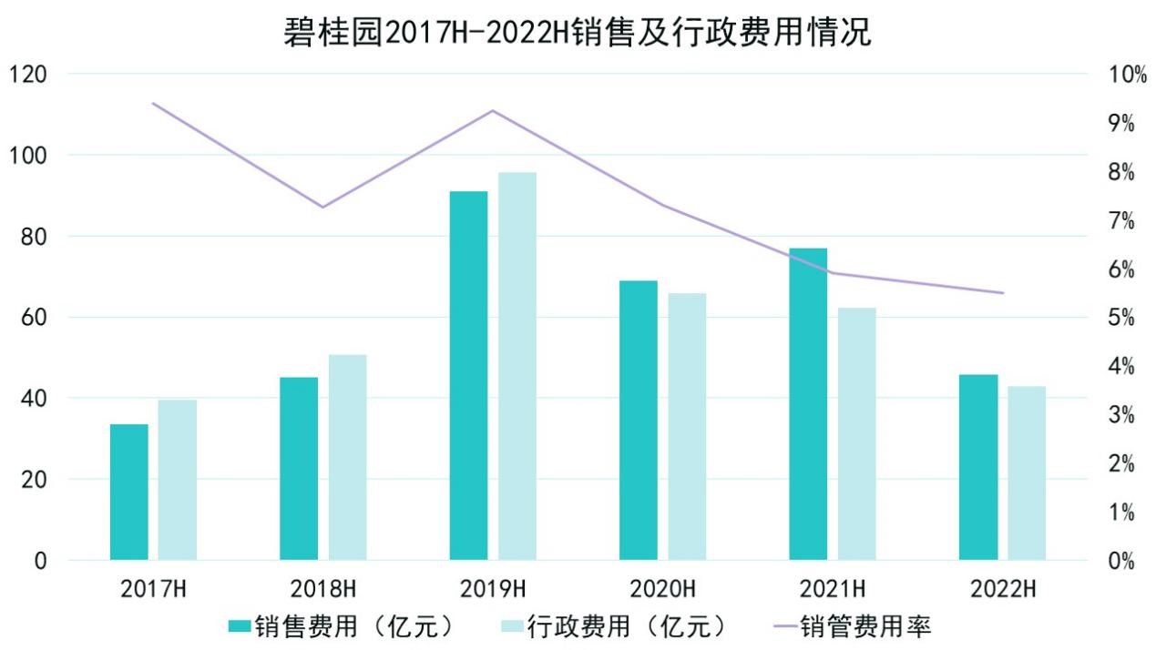 2022上半年,碧桂園銷管費用率再進一步下探到5.5%的水平,相比前幾年已有不小回落。