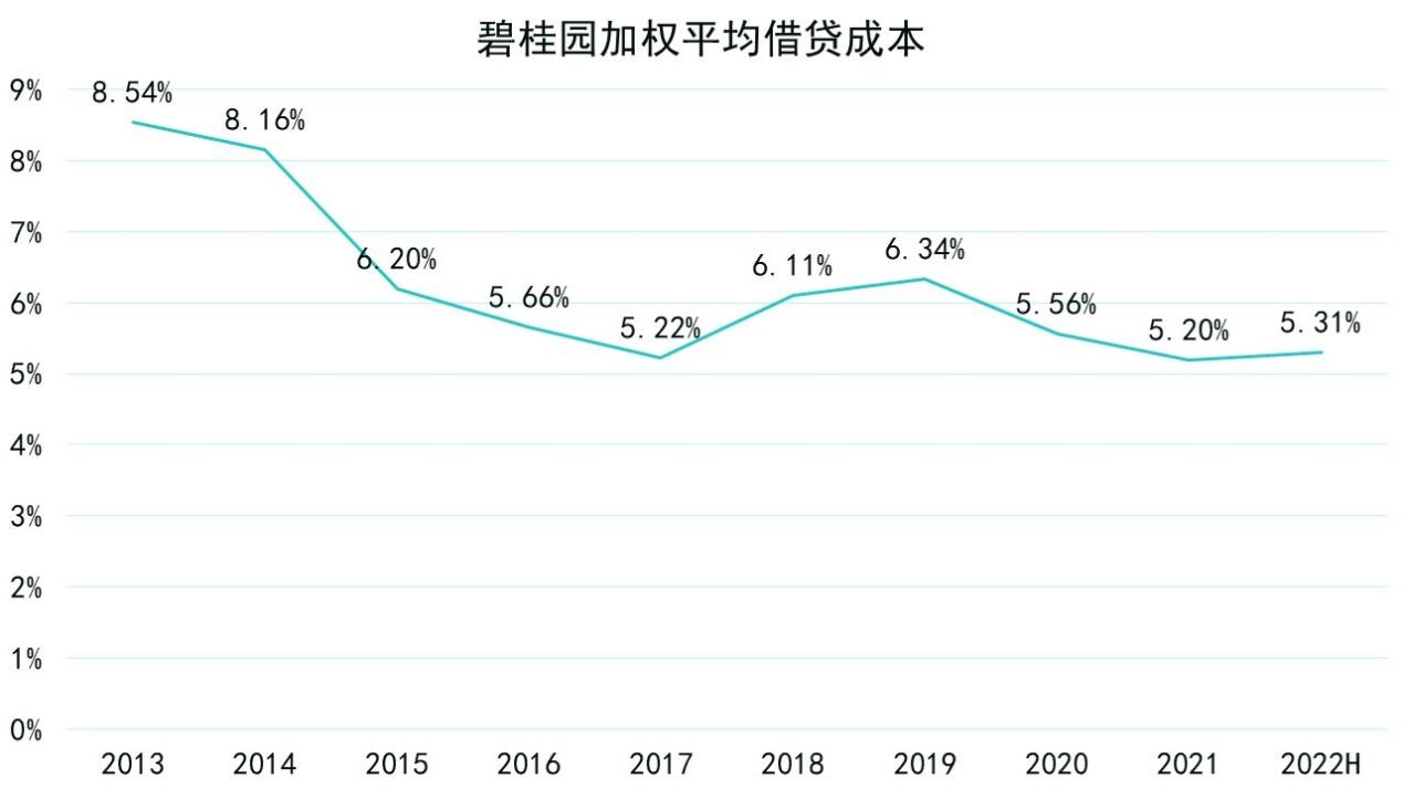 從圖表中可以窺見,2019年后碧桂園加權平均融資成本呈現(xiàn)逐年下降趨勢,于2021年加權融資成本降至近十年最低水平,2022上半年加權平均融資微漲至5.31%,對比2021年底上升11個基點,主要由于美國加息導致部分以浮動利率計價的外幣借款利率上升。