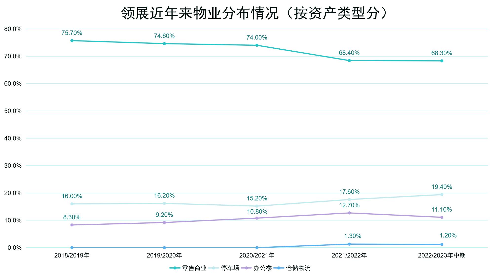 截至2022年9月30日,按資產(chǎn)估值2340億港元計(jì)算,從物業(yè)資產(chǎn)類型上看,領(lǐng)展資產(chǎn)總價(jià)值68.3%貢獻(xiàn)自零售物業(yè)、19.4%為停車場(chǎng)、11.1%來(lái)自寫字樓、1.2%來(lái)自物流地產(chǎn)。