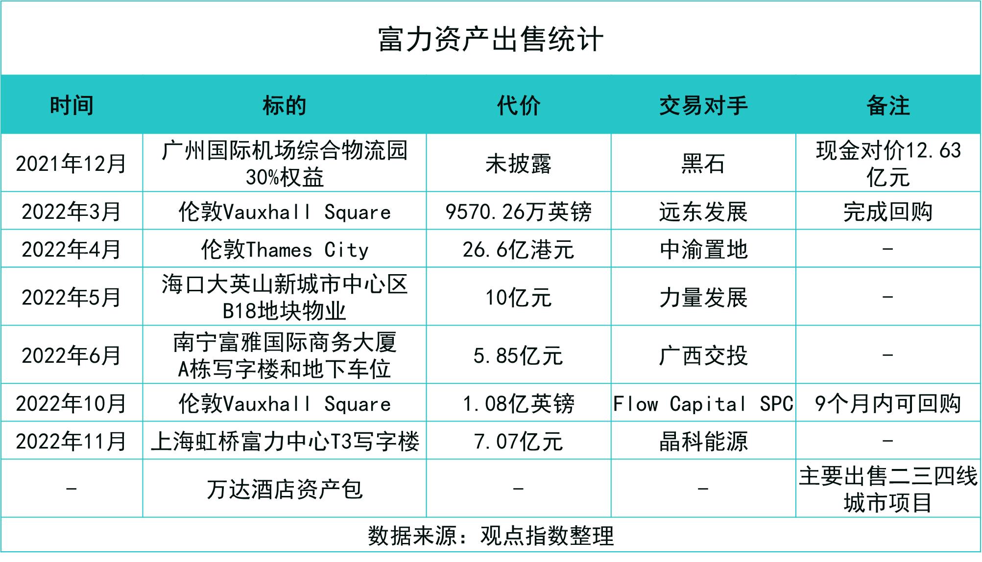 流動性困境出現(xiàn)后,富力不斷變賣資產(chǎn)換取現(xiàn)金流,以維持企業(yè)運轉(zhuǎn),包括甩賣萬達酒店資產(chǎn)包、拿出廣州物流園項目抵債、出售英國倫敦物業(yè)項目等。