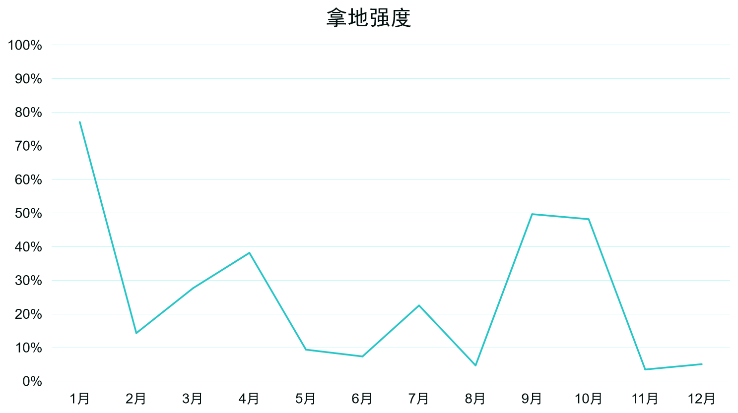 龍湖也并非每一環(huán)節(jié)都輕松, 不僅量入為出、縮衣節(jié)食,拿地節(jié)奏上也有所錯(cuò)峰,避開6-7月拿地高峰,抓住1月、10月拿地低點(diǎn)。