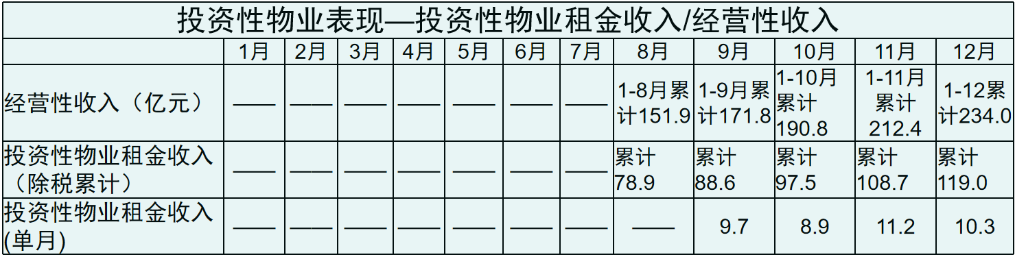 并且在年初更改了披露口徑,主動(dòng)將開發(fā)業(yè)務(wù)披露“合約銷售額”轉(zhuǎn)變?yōu)榕?ldquo;歸屬股東權(quán)益的合同銷售金額”權(quán)益銷售額;此外,從8月開始披露經(jīng)營性收入與租金。