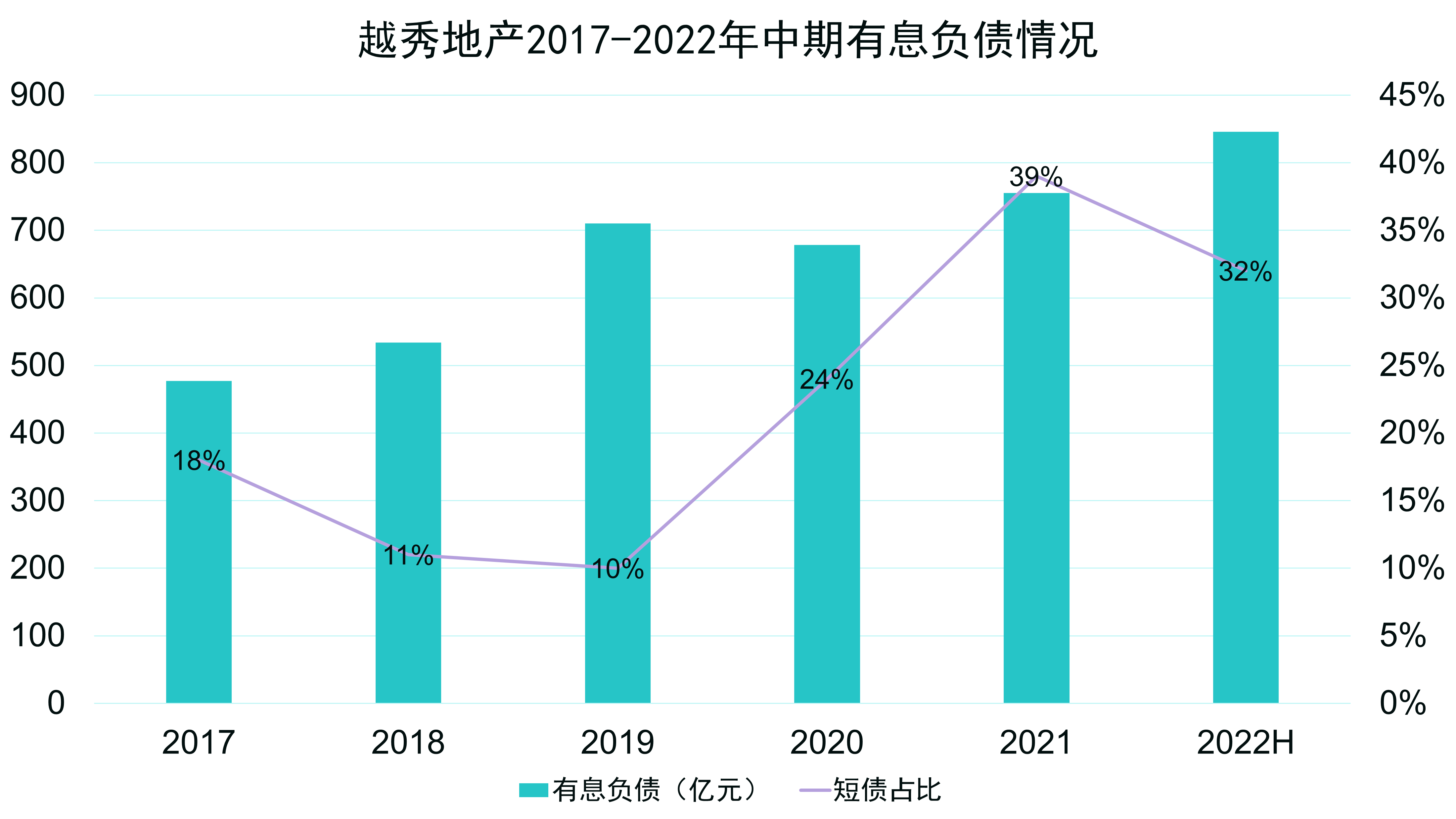 有息負(fù)債規(guī)模方面,截止到2021年末,越秀地產(chǎn)有息負(fù)債規(guī)模為755.3億元,其中短債比較前一年增加15%至39%。截至2022年中期,有息負(fù)債規(guī)模增至845.7億元,短債比則降至32%。