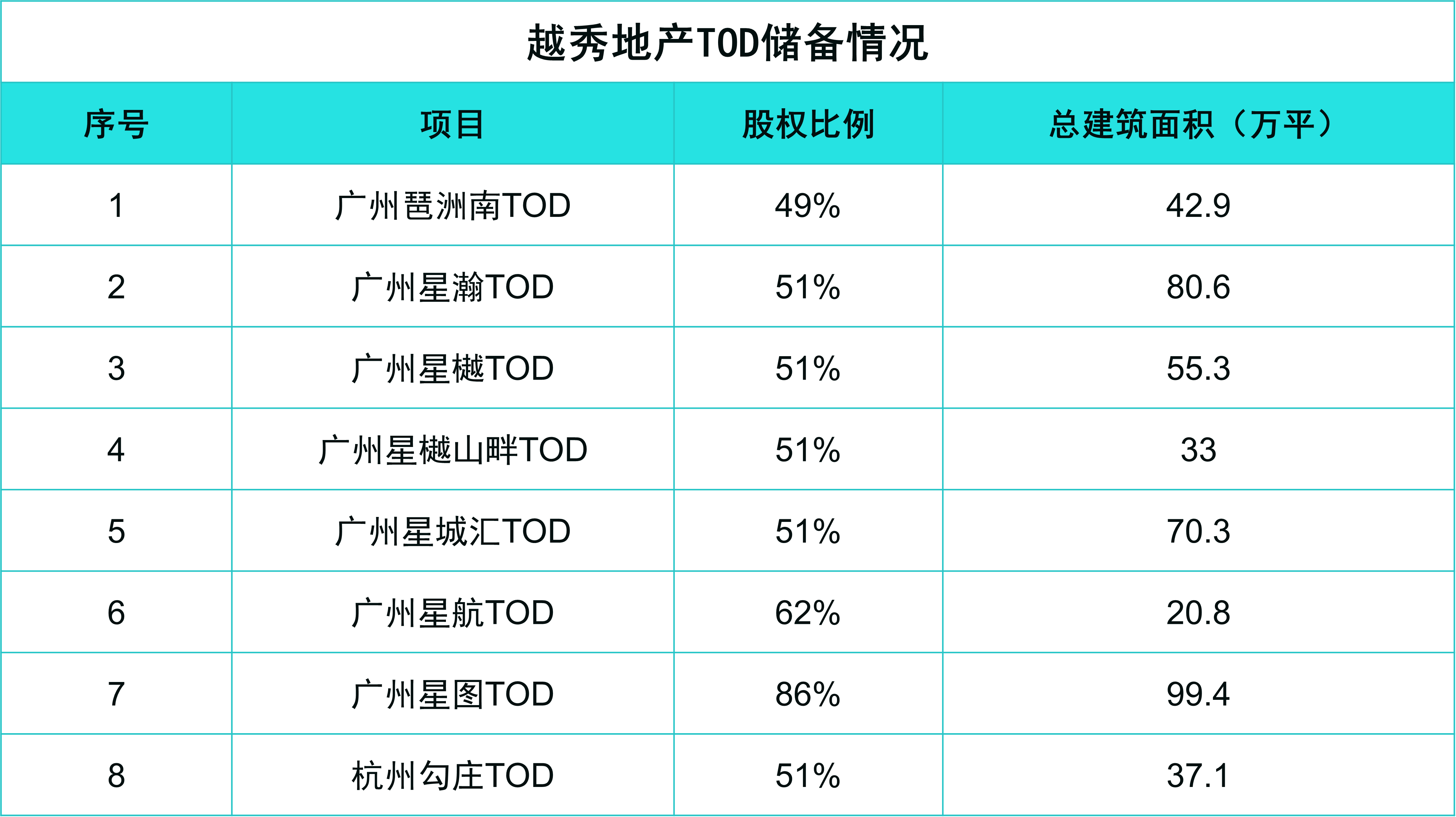 截至2022年6月底,越秀地產(chǎn)共擁有8個(gè)TOD項(xiàng)目,合計(jì)貢獻(xiàn)了359萬(wàn)平方米土地儲(chǔ)備,約占總土地儲(chǔ)備12.6%。