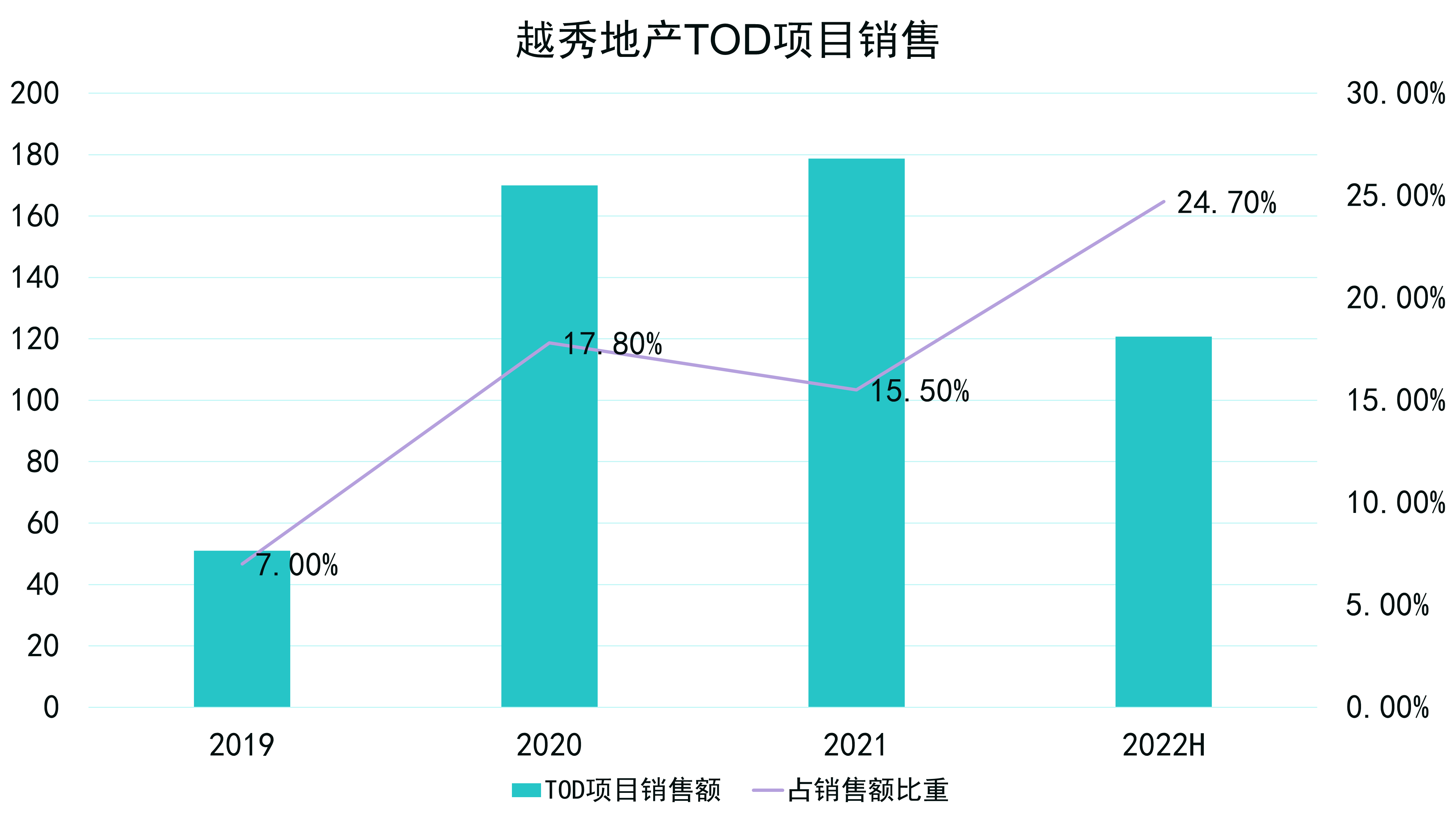 2020年,TOD項(xiàng)目實(shí)現(xiàn)合同銷(xiāo)售金額170億元,同比上升236.6%;2021年微增上5.1%至178.7億元;至2022年上半年,廣州TOD項(xiàng)目共實(shí)現(xiàn)合同銷(xiāo)售約120.7億元,同比上升58.8%,約占銷(xiāo)售總額的24.7%。