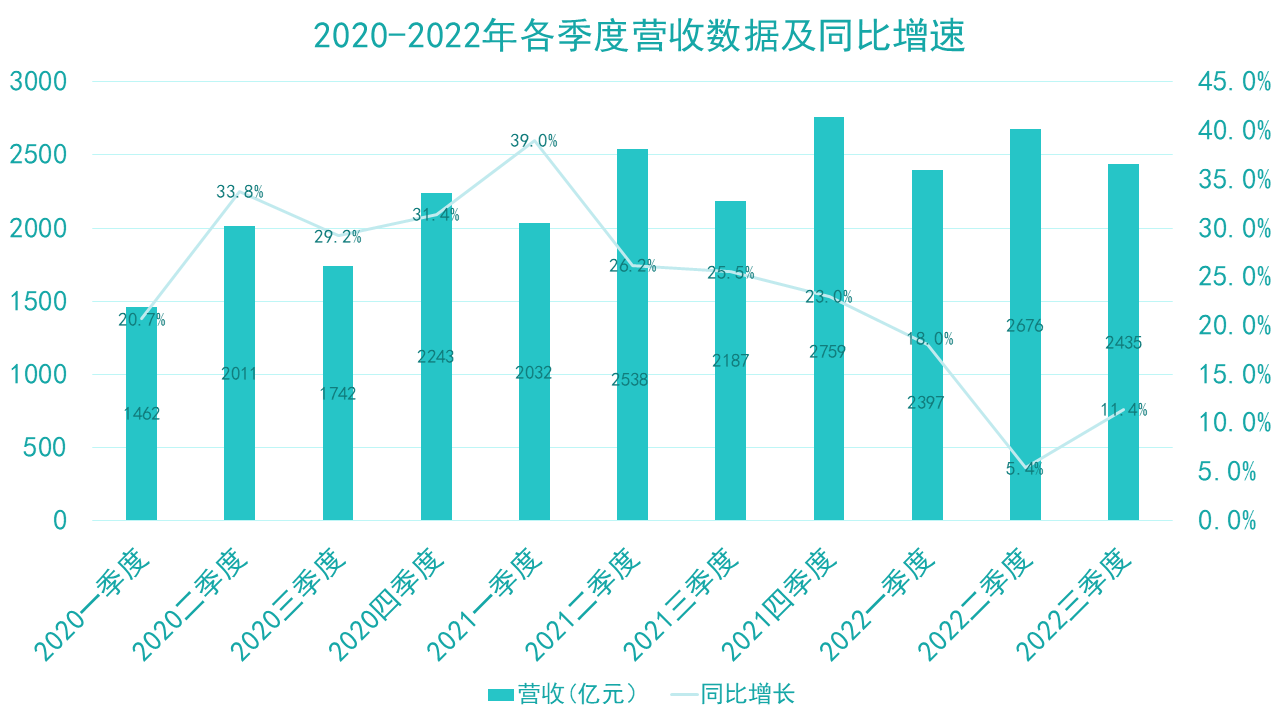 2022年11月,京東發(fā)布第三季度財(cái)報(bào),凈收入2435億元,同比增長(zhǎng)11.4%。其中,凈服務(wù)收入為465億元,同比增長(zhǎng)42.2%,占凈收入的比例達(dá)到19.1%;商品收入為1970億元,同比增長(zhǎng)5.9%;歸屬于普通股股東的凈利潤(rùn)為60億元,去年同期凈虧損28億元。
