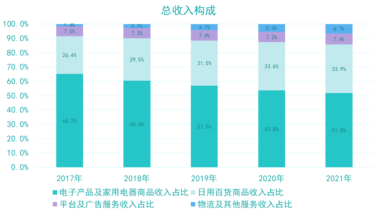 這是京東和其他電商平臺(tái)在品類(lèi)構(gòu)成上的明顯區(qū)別,也由此,對(duì)京東的影響更加顯而易見(jiàn)。