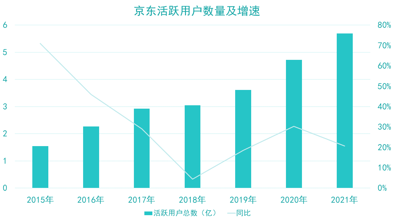 于2019年、2020年及2021年,京東年活躍用戶數(shù)分別達(dá)3.620億、4.719億及5.697億。