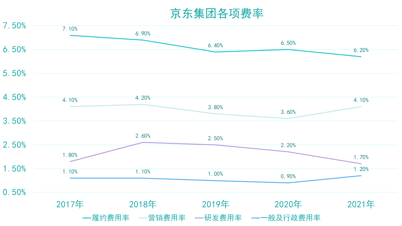 2018年后,隨著收入規(guī)模增長(zhǎng)以及前期各項(xiàng)費(fèi)用投入的成效逐漸顯現(xiàn),履約及研發(fā)等費(fèi)用率呈現(xiàn)持續(xù)下降態(tài)勢(shì),其中,履約費(fèi)用率從2018年的6.9%下降到2021年的6.2%,營(yíng)銷(xiāo)費(fèi)用率從2018年的2.6%下降到2021年的1.7%。