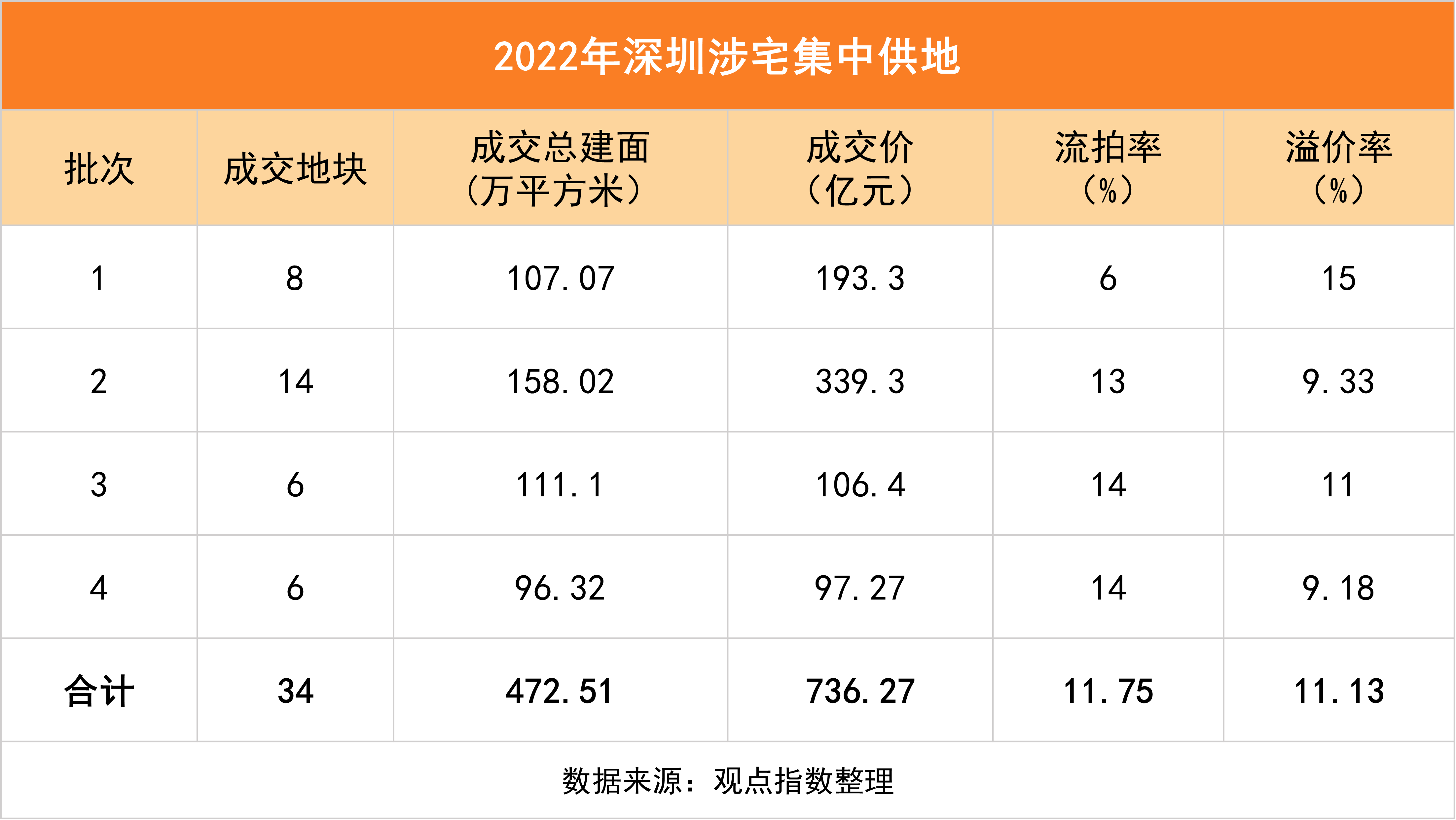2022年深圳四批次成交34宗地塊(2021年38宗),土地出讓金736.27億元,同比下降23.29%;成交總建筑面積472.51萬平方米,同比下降13.36%。溢價(jià)方面,4個(gè)批次地塊熱度不均,總體平均溢價(jià)為11.13%(與2021年接近)。