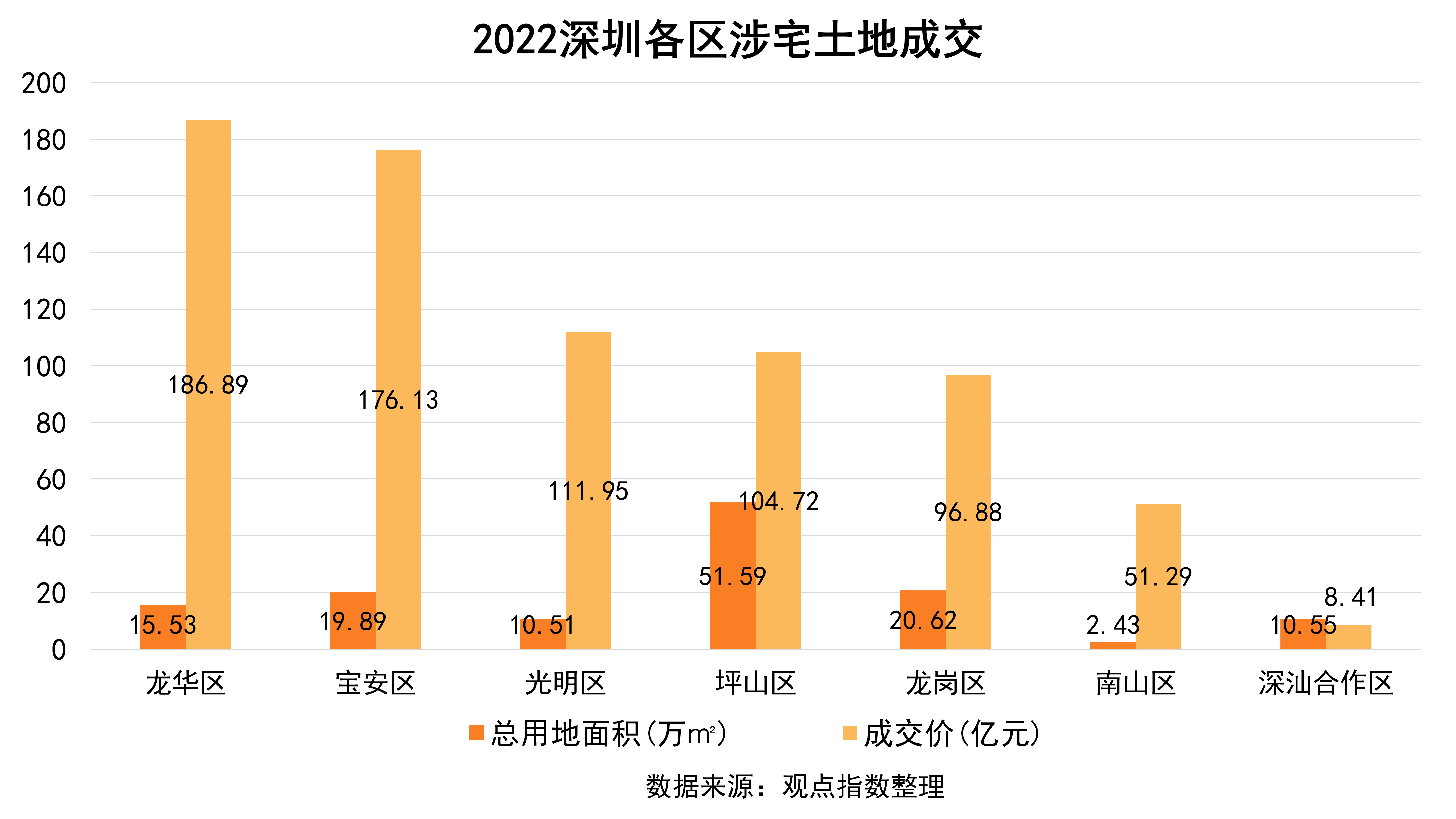 從區(qū)域來看,2022年深圳集中供地土地出讓金最高的前三個(gè)區(qū)是龍華區(qū)(186.89億)、寶安區(qū)(176.13億)、光明區(qū)(111.95億),三區(qū)所占比例為64.5%。