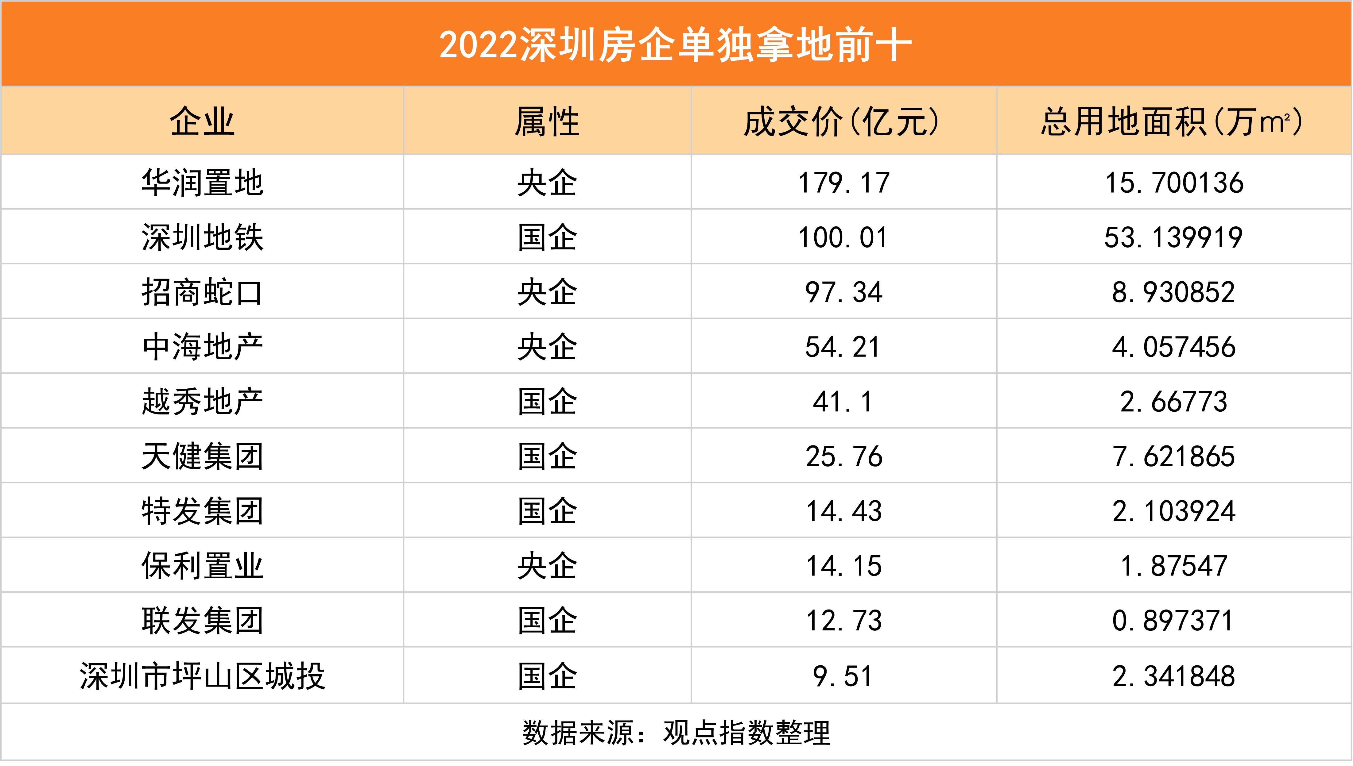 從單獨(dú)拿地前十來看,前三企業(yè)為華潤置地(179億)、深圳地鐵(100.01億)和招商蛇口(97.34億)。其中,值得一提的是華潤置地花費(fèi)的土地出讓金最多,深圳地鐵則以拿地面積最高53.14萬平方米位居前列。