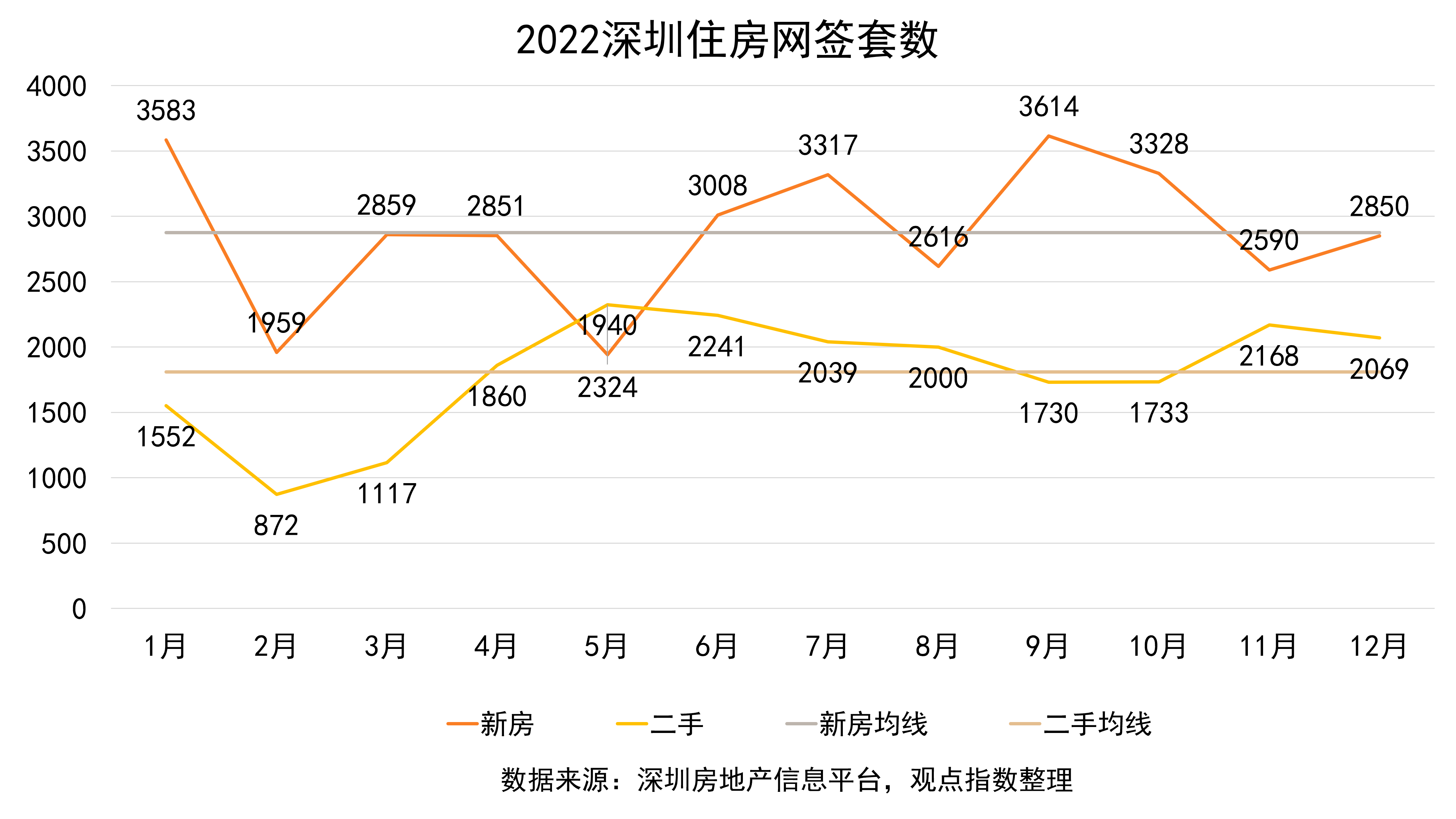 據(jù)觀點(diǎn)指數(shù)監(jiān)測(cè),2022年深圳全市網(wǎng)簽套數(shù)為5.6萬套,比2021年少了3.7萬套,同比下降39.76%。其中,新建住宅網(wǎng)簽成交為34515套,同比下降34.32%;二手住宅網(wǎng)簽成交為21705套,同比下降46.77%。新建住宅和二手住宅月平均網(wǎng)簽成交套數(shù)分別為2876套、1808套。