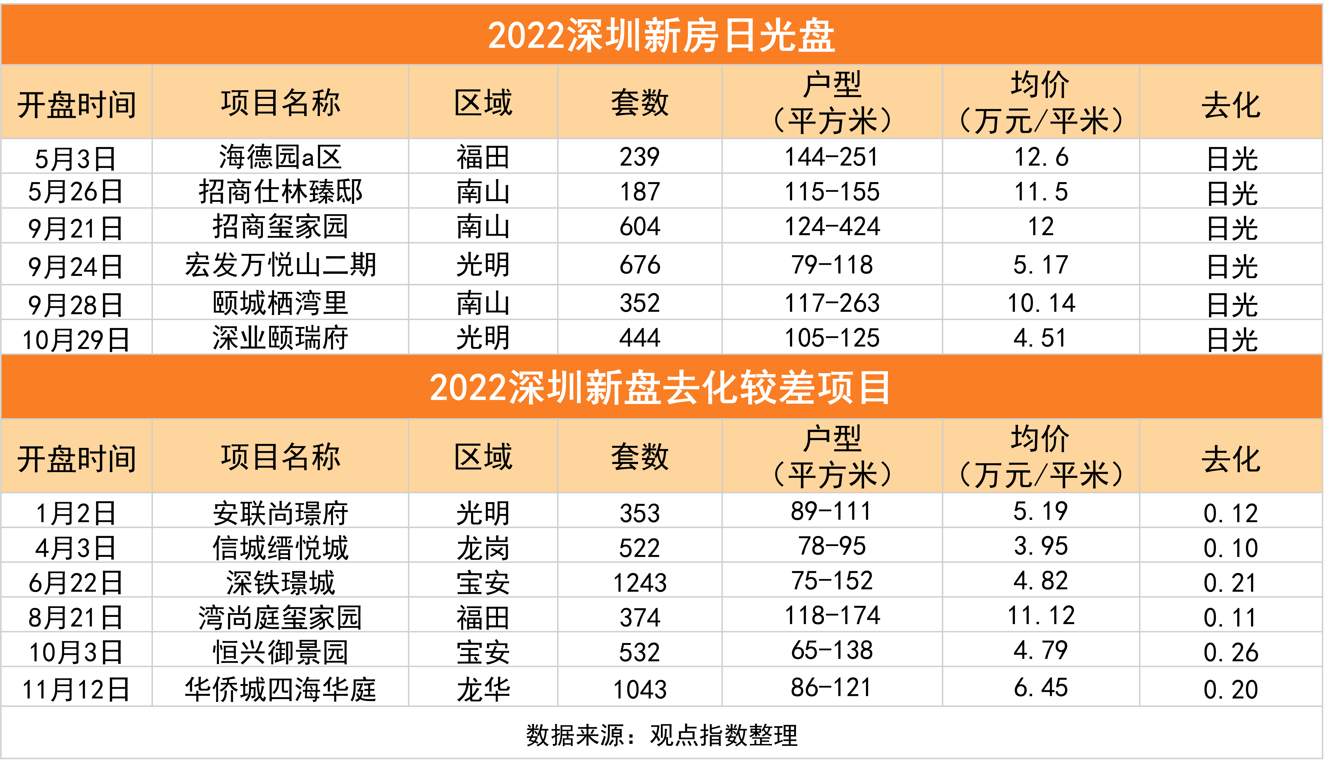 據(jù)市場(chǎng)研究,2022年深圳開盤當(dāng)日售罄項(xiàng)目僅有6個(gè),而2021有29個(gè)。根據(jù)觀點(diǎn)指數(shù)統(tǒng)計(jì),日光盤主要集中在南山區(qū),并且以大面積戶型為主,定價(jià)基本不低于1000萬。