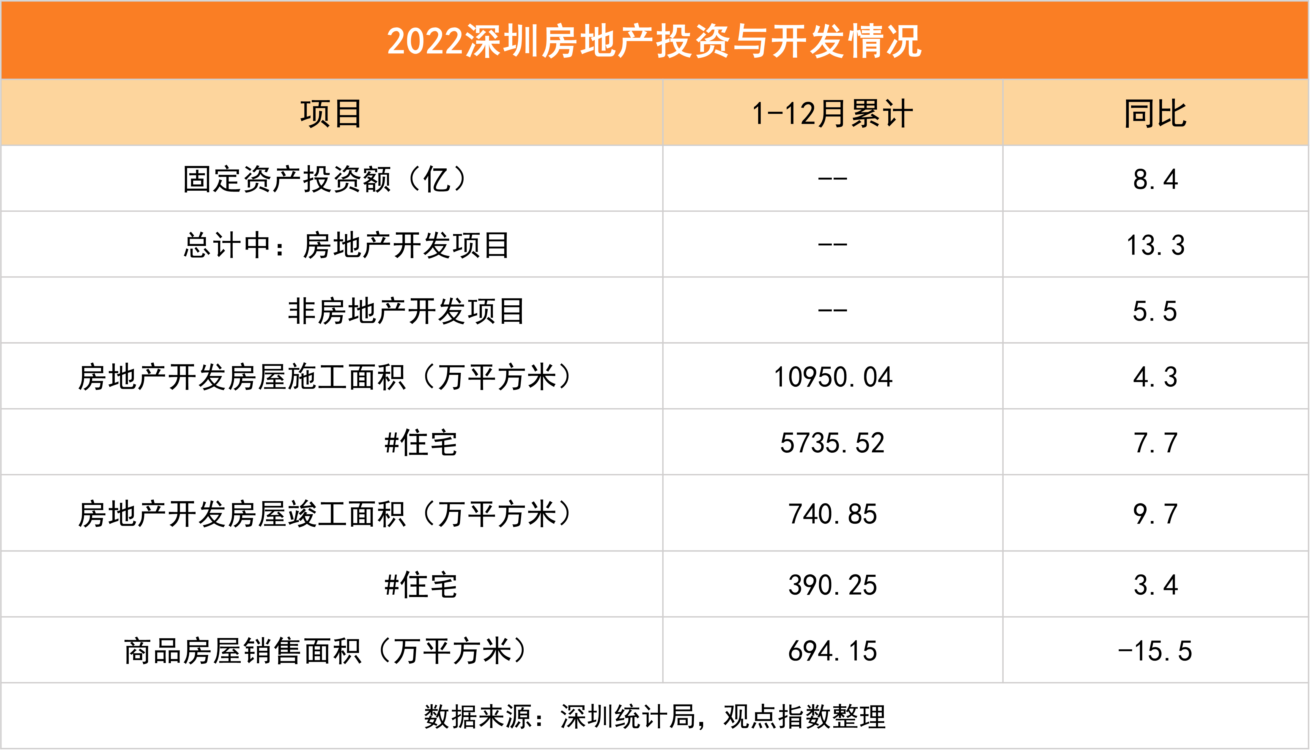從統(tǒng)計(jì)局披露的數(shù)據(jù)來看,2022年深圳房地產(chǎn)開發(fā)項(xiàng)目投資同比增長13.3%,比非房項(xiàng)目投資高出8個(gè)百分點(diǎn)。其中受"保交樓"政策驅(qū)動(dòng),住宅房屋竣工面積為390.25萬平方米,同比增長3.4%。