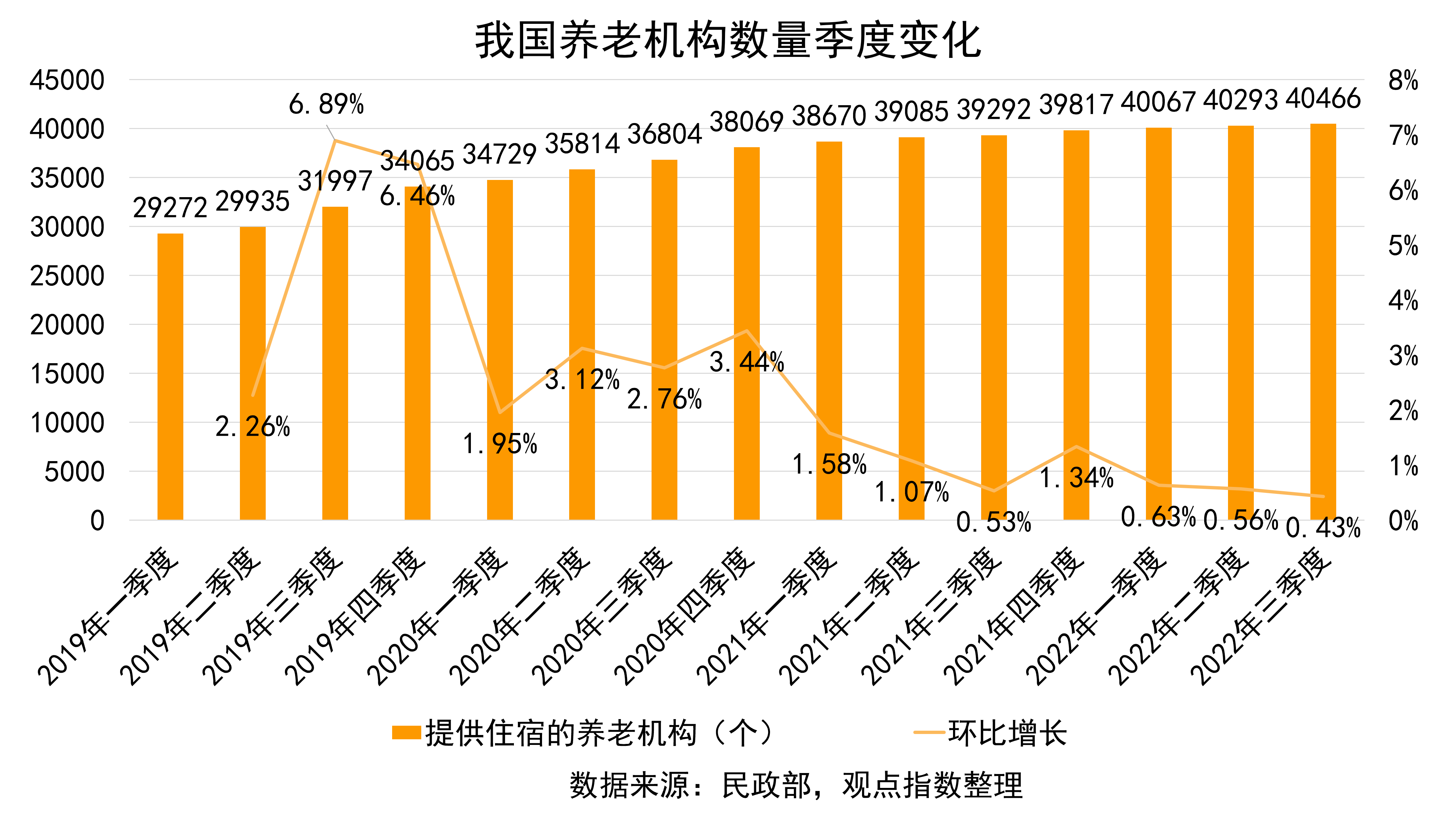 然而從近幾個季度數(shù)據(jù)來看,養(yǎng)老機(jī)構(gòu)整體增速已明顯放緩。提供住宿的養(yǎng)老機(jī)構(gòu)40466個,環(huán)比上升0.43%,同比上升2.99%;提供住宿的養(yǎng)老機(jī)構(gòu)床位共509.3,環(huán)比上升0.41%,同比上升1.92%。