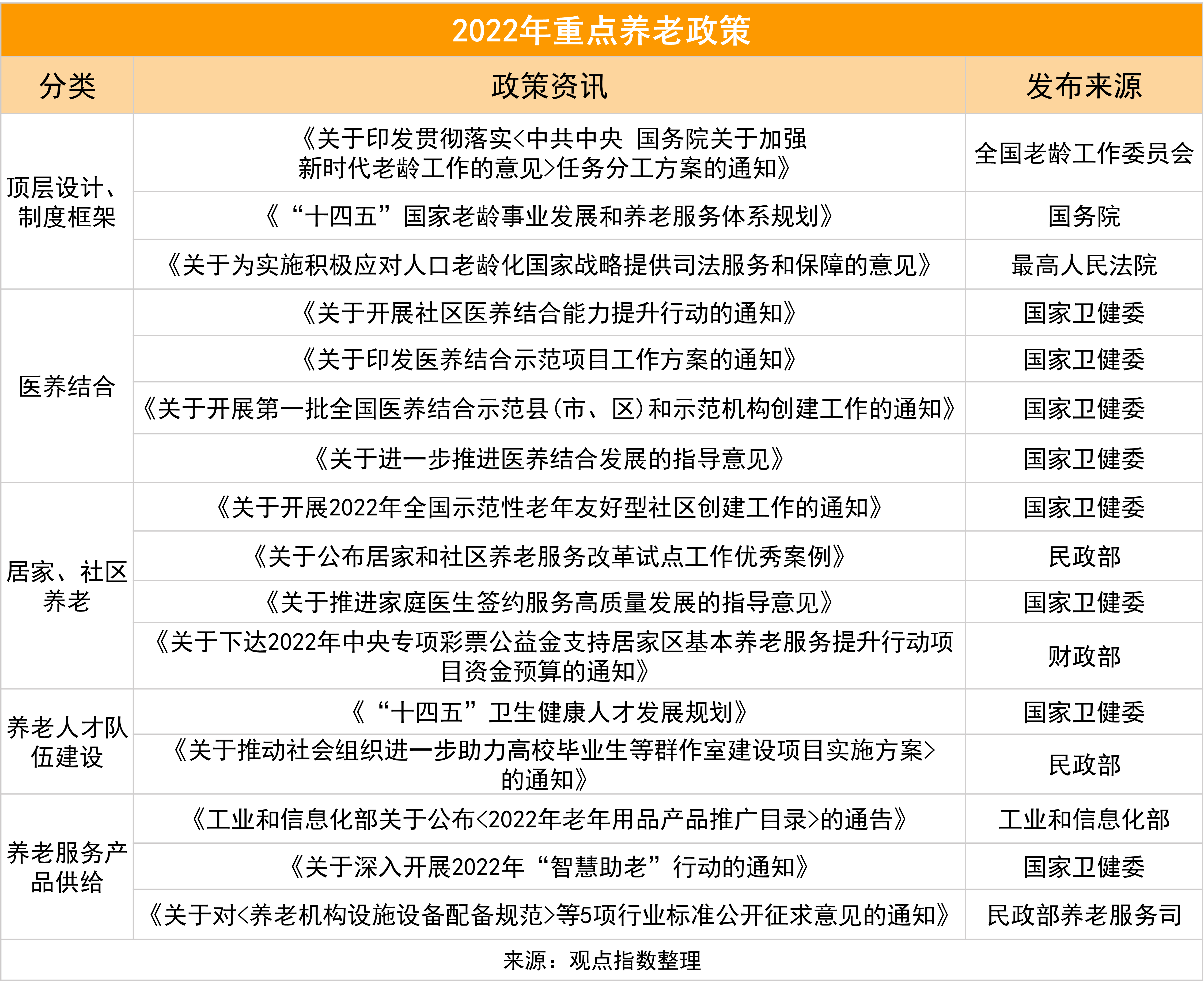 觀點指數(shù)對年內(nèi)影響?zhàn)B老行業(yè)發(fā)展的相關(guān)政策進(jìn)行梳理,可以看到2022年相關(guān)政策除了頂層設(shè)計的全面性文件,還針對醫(yī)養(yǎng)結(jié)合、居家社區(qū)養(yǎng)老、人才培訓(xùn)及養(yǎng)老產(chǎn)品提供等細(xì)分領(lǐng)域做了規(guī)劃和指引。