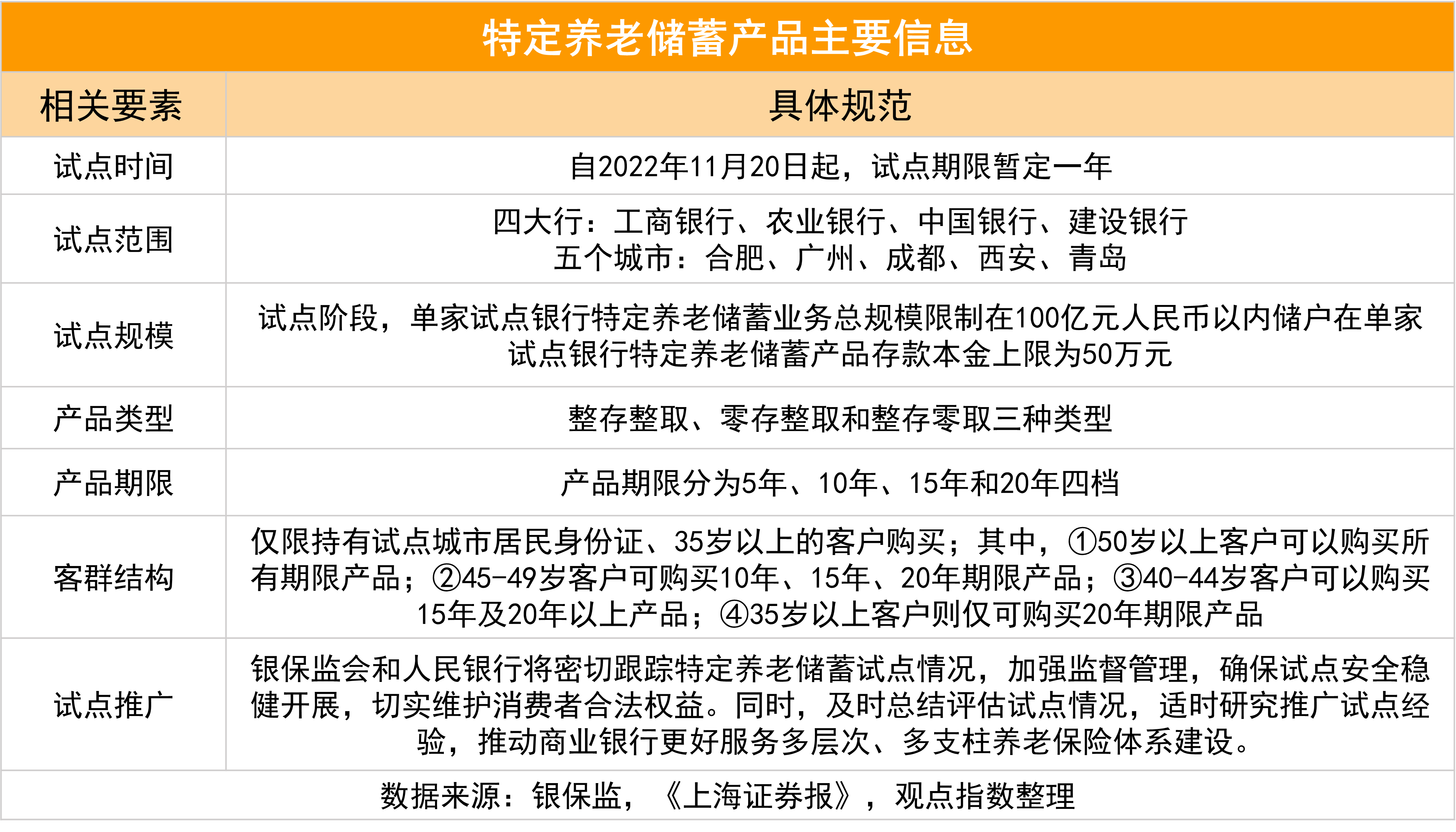 為此,央行、銀保監(jiān)會于2022年7月29日發(fā)布《關(guān)于開展特定養(yǎng)老儲蓄試點工作的通知》,試行個人養(yǎng)老金相關(guān)產(chǎn)品以補充民眾對養(yǎng)老金融產(chǎn)品的需求。