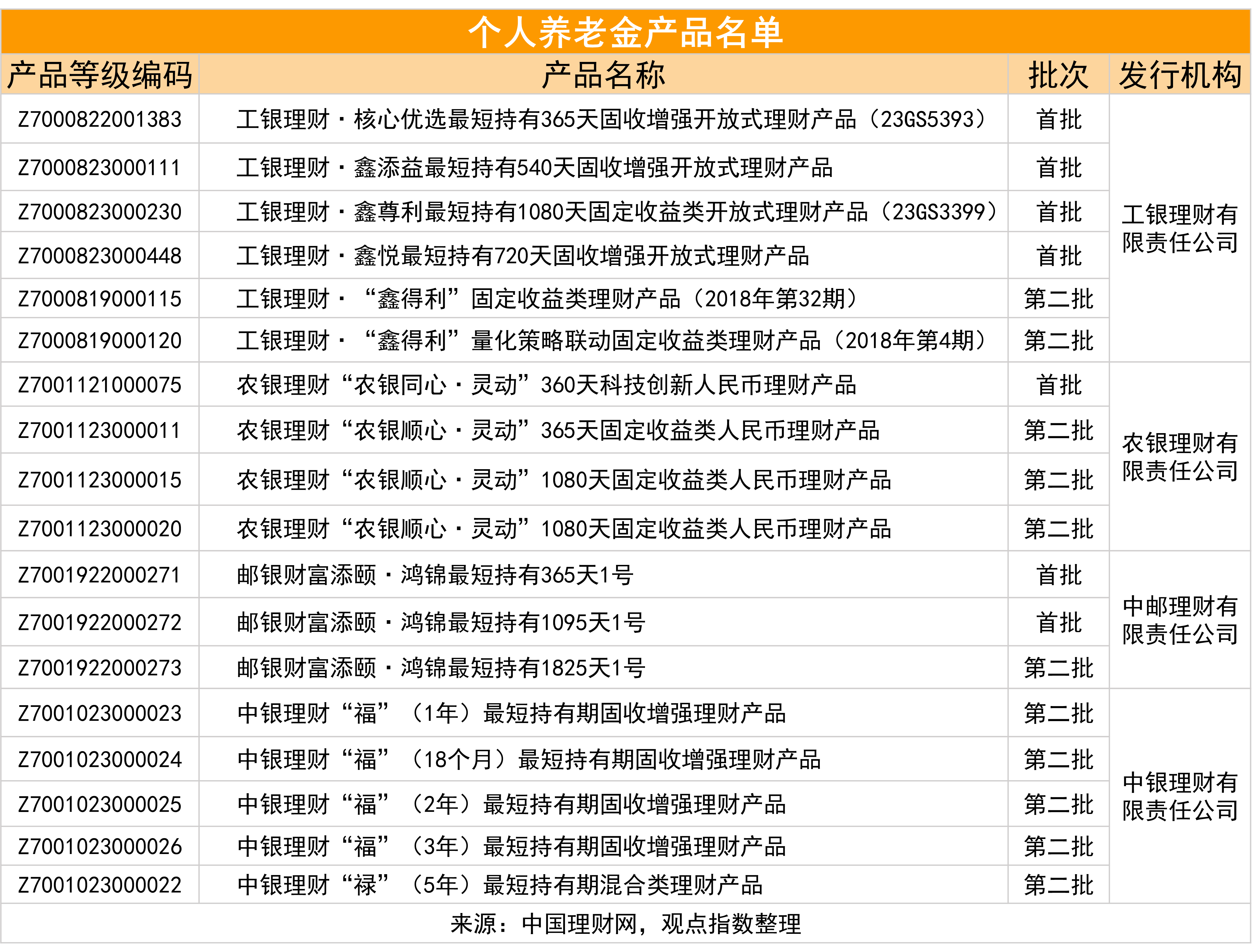 去到今年2月10日,首批7只個人養(yǎng)老金發(fā)布,并很快在2月24日迎來第二批11只產(chǎn)品,兩批產(chǎn)品包括工銀理財、農(nóng)銀理財、中郵理財和中銀理財四家理財公司。