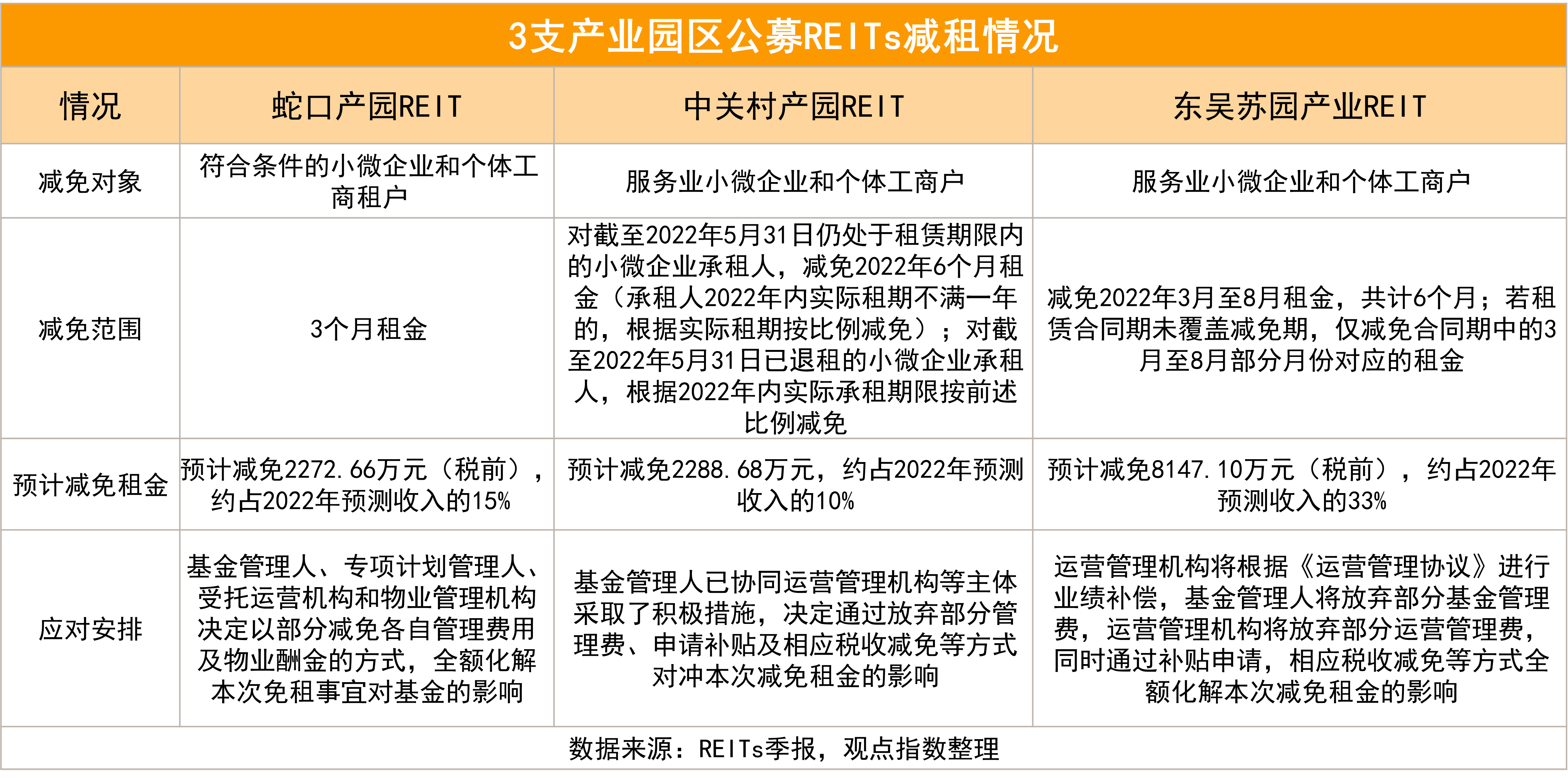 除了續(xù)租情況不及預(yù)期外,園區(qū)REITs的底層資產(chǎn)相當(dāng)部分屬于國(guó)有園區(qū),需履行社會(huì)責(zé)任,因此在疫情防控期間執(zhí)行免租政策,大幅影響了園區(qū)REITs的收入情況。