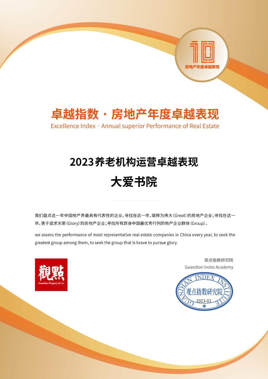 大愛書院“2023養(yǎng)老機(jī)構(gòu)運(yùn)營卓越表現(xiàn)”證書