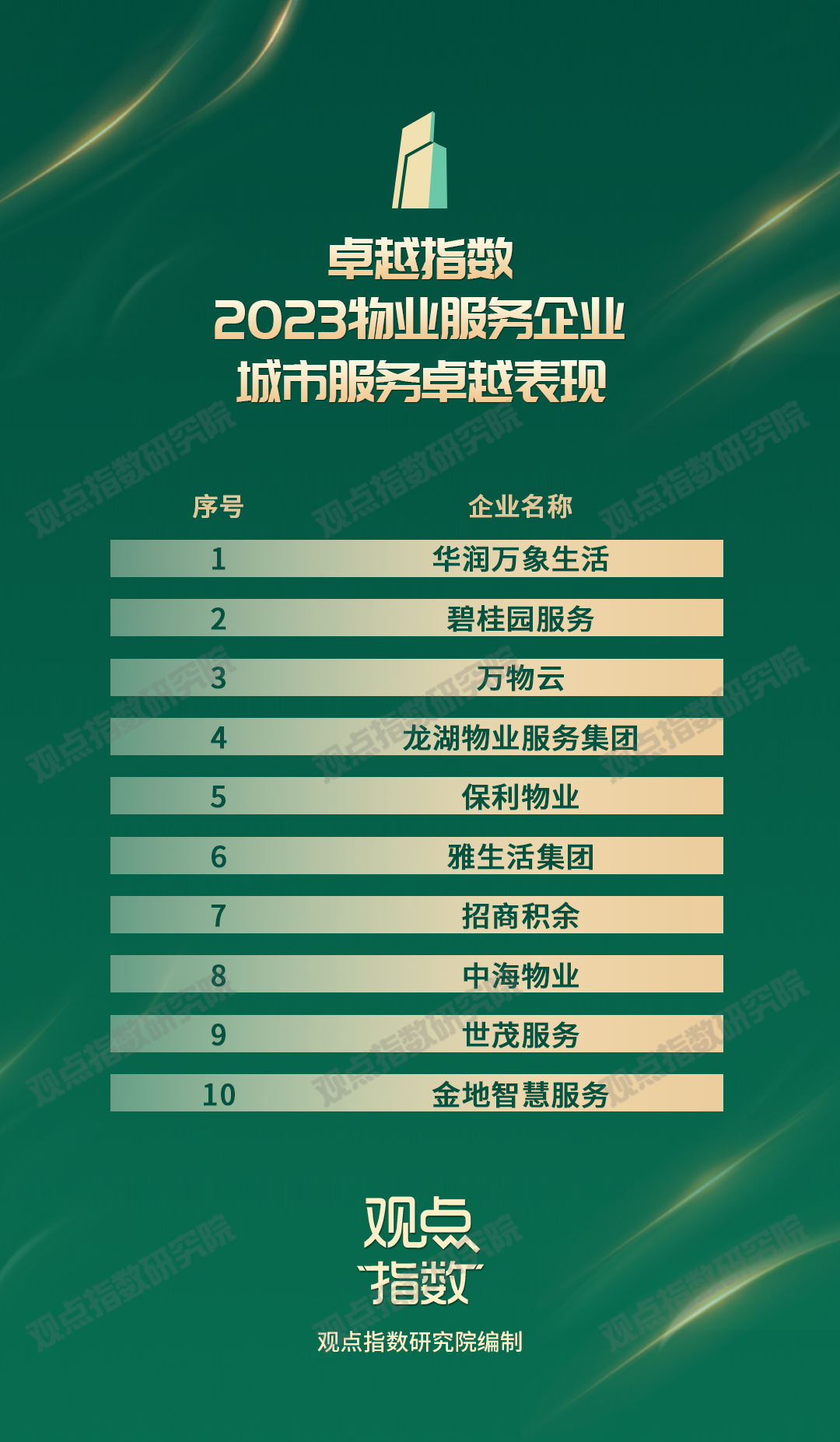 以下為《2023 物業(yè)企業(yè)城市服務(wù)卓越表現(xiàn)報(bào)告》及研究成果,更多請點(diǎn)擊2023觀點(diǎn)物業(yè)卓越指數(shù) - 觀點(diǎn)網(wǎng) (guandian.cn)閱讀。