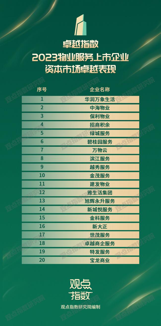 以下為《2023物業(yè)服務(wù)上市企業(yè)資本市場(chǎng)卓越表現(xiàn)報(bào)告》及研究成果,更多請(qǐng)點(diǎn)擊2023觀點(diǎn)物業(yè)卓越指數(shù) - 觀點(diǎn)網(wǎng) (guandian.cn)閱讀。