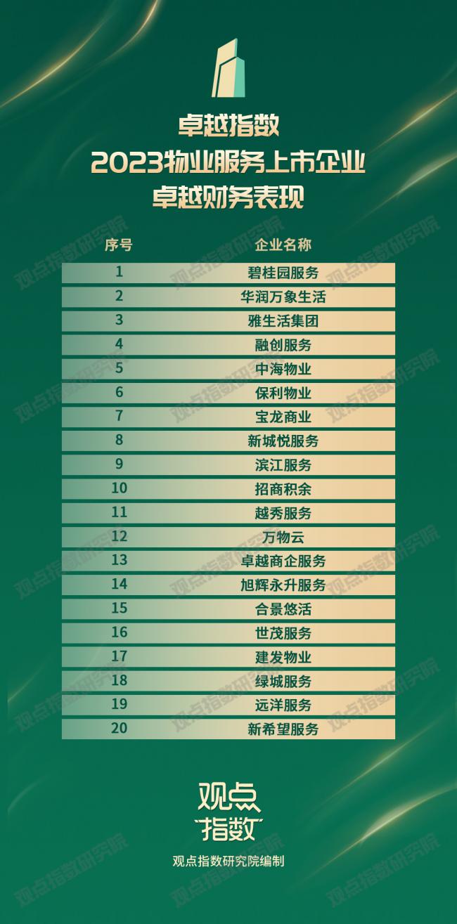 以下為《2023 物業(yè)服務(wù)上市企業(yè)卓越財(cái)務(wù)表現(xiàn)報(bào)告》及研究成果,更多請(qǐng)點(diǎn)擊2023觀點(diǎn)物業(yè)卓越指數(shù) - 觀點(diǎn)網(wǎng) (guandian.cn)閱讀。