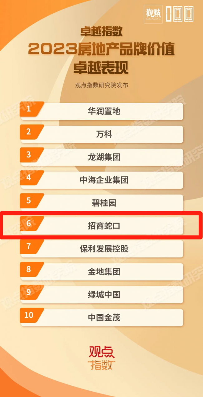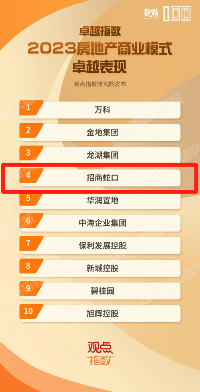 3月22日,“卓越指數(shù)·2023房地產(chǎn)年度卓越表現(xiàn)”研究成果由觀點(diǎn)機(jī)構(gòu)重磅發(fā)布,招商蛇口憑借優(yōu)秀的綜合實(shí)力和細(xì)分領(lǐng)域的卓越表現(xiàn),還斬獲“2023房地產(chǎn)企業(yè)品牌價(jià)值卓越表現(xiàn)”“2023房地產(chǎn)商業(yè)模式卓越表現(xiàn)”等多項(xiàng)大獎(jiǎng)。