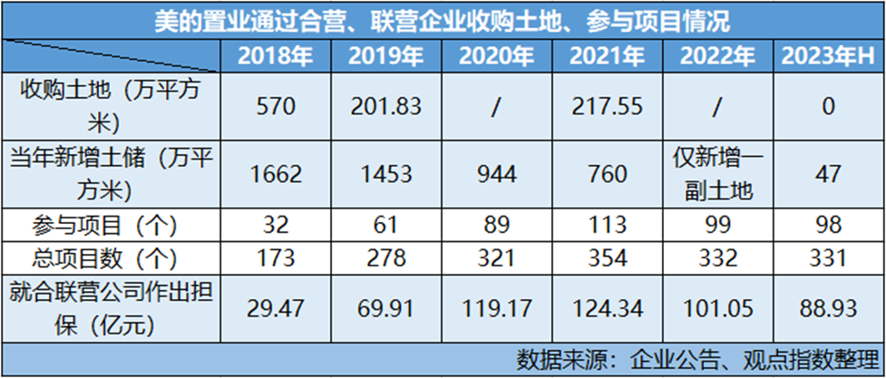 數(shù)據(jù)顯示,2018年上市至2021年4年內(nèi),美的置業(yè)通過合營(yíng)、聯(lián)營(yíng)企業(yè)參與項(xiàng)目數(shù)量,以及就合聯(lián)營(yíng)公司作出擔(dān)保金額,持續(xù)攀升。到2021年末,該公司通過合營(yíng)、聯(lián)營(yíng)企業(yè)參與項(xiàng)目113個(gè),占總項(xiàng)目數(shù)量約32%,提供擔(dān)保124.34億元。