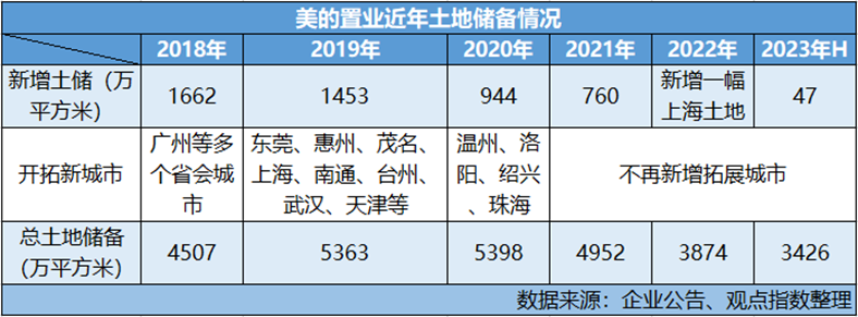 2023年,美的置業(yè)雖然重啟拿地但力度依然較弱,上半年僅在佛山、長(zhǎng)沙、邯鄲三個(gè)傳統(tǒng)深耕城市有斬獲,新增土地儲(chǔ)備約47萬平方米。