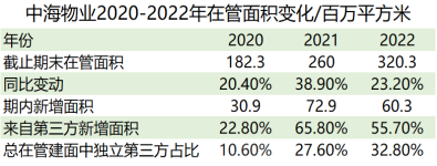 2020年至2022年,中海物業(yè)截至各期末在管面積分別為1.82億平方米、2.6億平方米及3.203億平方米,同比增長分別為20.40%,38.90%及23.20%;來自第三方新增面積分別占比為22.80%,65.80%及55.70%;總在管建面中獨立第三方占比分別為10.60%,27.60%及32.80%。