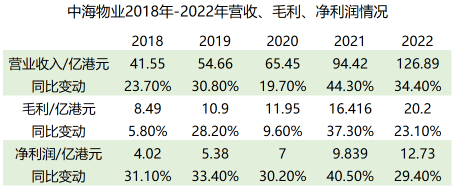 此時,中海物業(yè)在管建筑面積已從2018年末的1.41億平方米增至2022年末的3.2億平方米。此外還跨入了百億營收俱樂部,截至2022年末營收總額126.89億港元,較上年度的94.42億港元同比增長34.40%。