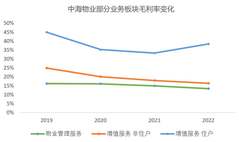 2023年中期業(yè)績顯示,中海物業(yè)物業(yè)管理服務收入51.63億港元,占總收入的72.1%;非住戶增值服務12.05億港元,占總收入的16.8%;住宅增值服務7.11億港元,占總收入的9.9%;其中,非住戶和住戶增值服務收入總占比約為26..7%。