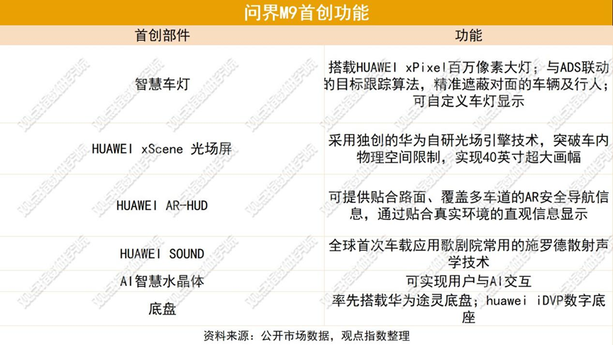 問界M9共有6項(xiàng)首次創(chuàng)新,分別為車燈、光場(chǎng)屏、AR-HUD、HUAWEI SOUND、AI智慧水晶體以及底盤。