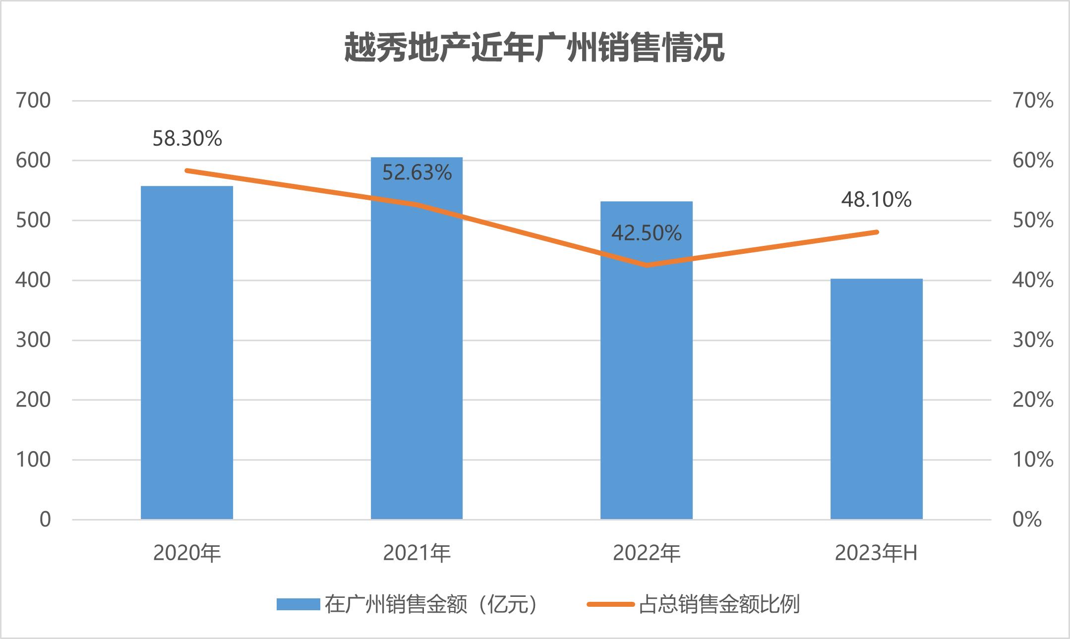 從銷售資料上看,越秀地產(chǎn)2021年在廣州區(qū)域?qū)崿F(xiàn)的合同銷售額606億元,同比增長8.6%,占全部銷售額約52.63%;2022年資料為銷售金額531.9億元,占比42.5%;2023年上半年,越秀地產(chǎn)在廣州實現(xiàn)銷售402.6億元,占比達48.1%。