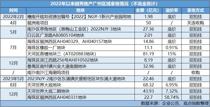 11月,以15%溢價率拿下位于成都成華區(qū)槐樹店路26號地塊;12月47.85億元斬獲普陀產(chǎn)業(yè)園地塊,溢價率達到10%;12月末43.93億元競得廣州世界大觀二期地塊,溢價率7.32%;22.7億元摘得廣州海珠區(qū)琶洲西區(qū)地塊,溢價率58.74%;30.31億元搖中西安高新區(qū)地塊,溢價率15%;