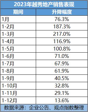 全年的高增長也受到影響,2023年前3個月越秀地產(chǎn)錄得銷售增幅217%,半年度時候為71%,到9月末增幅降至40.5%,最新增幅下滑到13.6%。