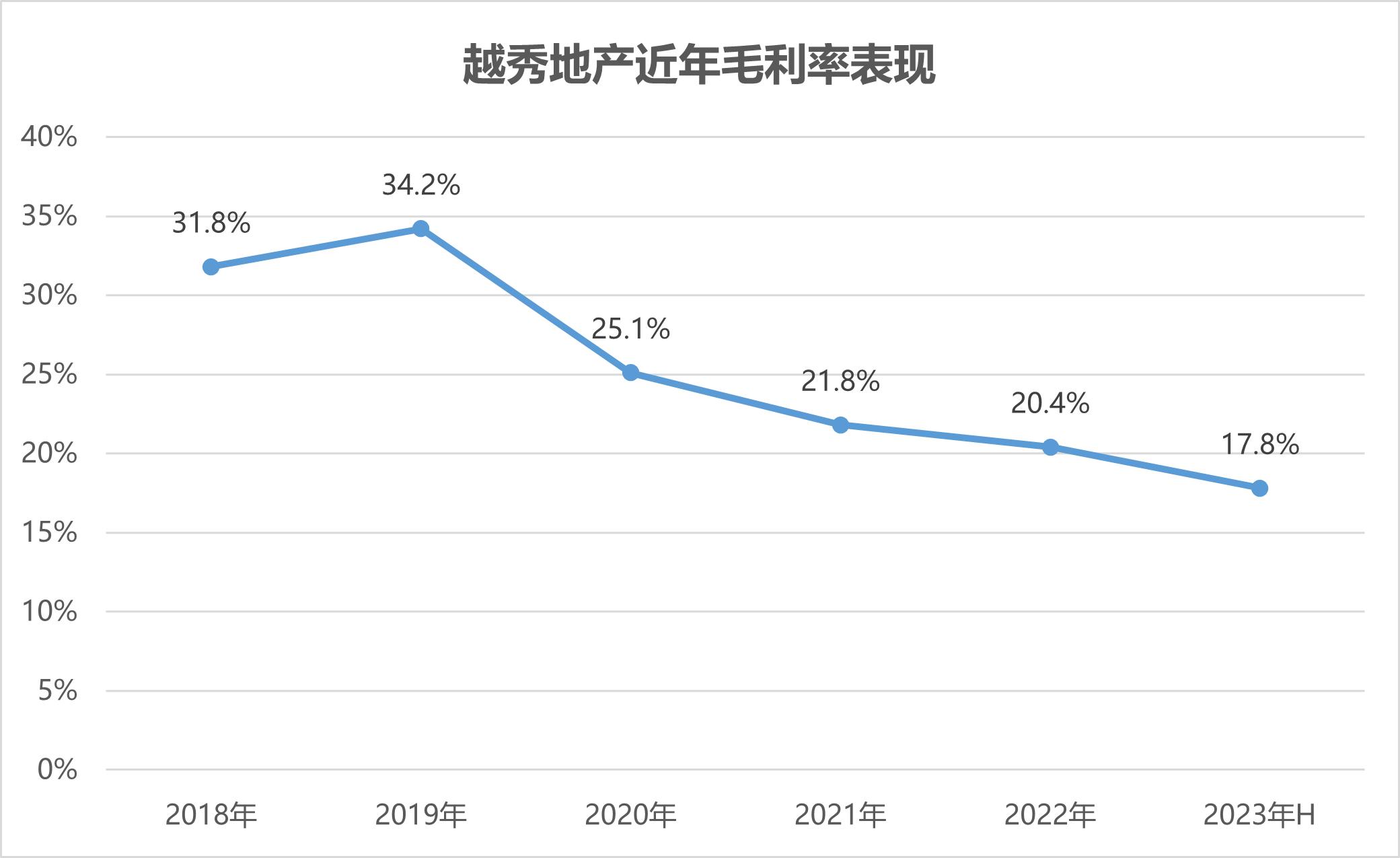 反映到利潤端,據(jù)2023年半年報,越秀地產(chǎn)毛利潤為57億元,同比降低14.2%。毛利率為17.8%,首次下降至20%以下。
