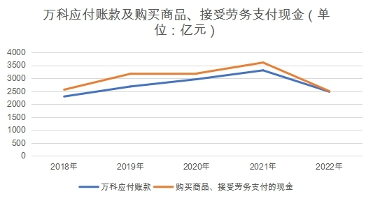 結合上一組應付賬款數據,可以發(fā)現(xiàn)從2018到2021年間,萬科當年實際支付的購買商品、接受勞務所需金額,都高于上年末的應付賬款金額,但在2022年發(fā)生反轉,實際付款金額比上年末節(jié)點金額低了803億元。
