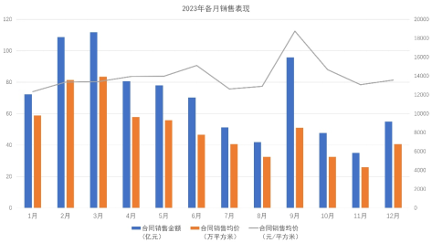 對(duì)比得知,2023年較2022年合同銷售金額減少845.6億元,降幅約49.94%;合同銷售面積減少677.1萬(wàn)平方米,降幅約52.7%;合同銷售均價(jià)增加770元/平方米。
