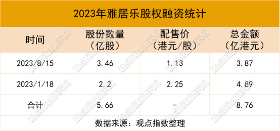 2023年,雅居樂集團(tuán)兩次進(jìn)行股權(quán)融資,總配售金額8.76億港元,但由于股市行情低迷、股價受挫,股權(quán)融資已經(jīng)很難繼續(xù)滿足雅居樂的資金需求。